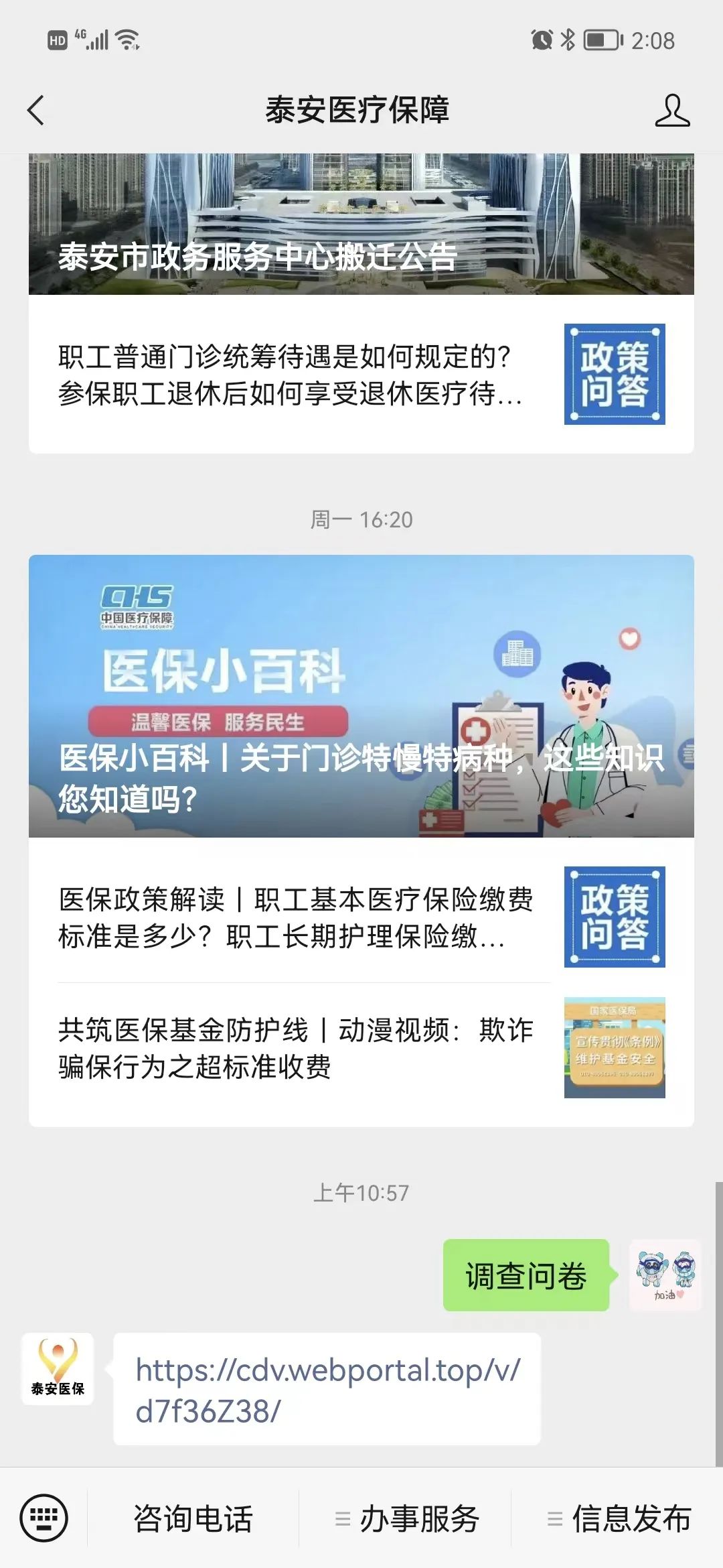 2、扫描下方二维码,进入“泰安医疗保障”微信公众号,在对话框输入“调查问卷”,点击链接直接跳转参与。
