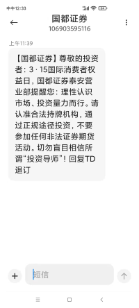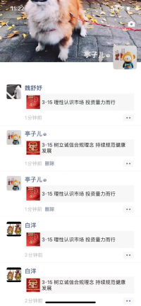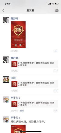为进一步扩大投资者教育宣传范围,增强投资者保护力度,我部充分运用线上渠道,组织营业部员工用微信朋友圈转发由深圳证券交易所、山东证监局和国都证券总部制作的3·15活动相关的投教文章和图片。营业部也在3月15日当天给营业部客户发了3·15活动公益短信,提醒客户理性认识市场,投资量力而行,通过正规途径投资,切勿参加任何非法证券期货活动。