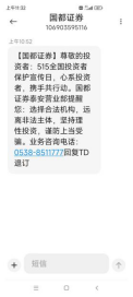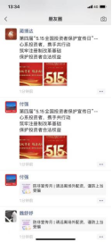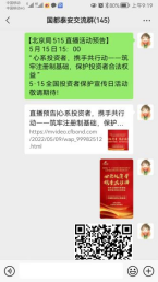 为了让投资者保护理念深入人心,进一步扩大宣传范围,营业部充分利用线上宣传渠道,组织员工在微信朋友圈和微信群转发上交所投教和总部发布的投教文章及图片。并在5·15前期和当天转发北京局5·15直播活动链接,并组织员工邀请投资者积极观看。营业部在5月15日当天给投资者发布了5·15公益短信,提醒客户选择合法机构,远离非法主体,坚持理性投资,谨防上当受骗。
