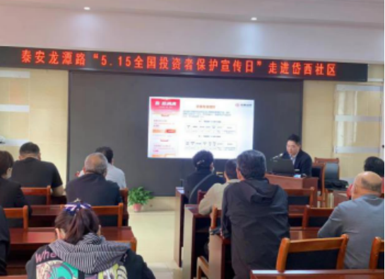 在第四届“5.15全国投资者保护宣传日”来临之际,为积极面对投资者教育工作新形势下的新问题,倡导理性投资文化,强化投资者保护意识,引导投资者树立正确的投资理念,提高金融反欺诈能力,市地方金融监管局组织泰安证券投资者教育中心与泰山区岱西社区联合举办了证券知识宣讲活动。本次活动泰安证券投资者教育中心认真分析资本市场案例资料,精心编写课件,通过举办《警惕团伙作案,误入证券投资圈套》、《投资理财基础知识》两场讲座,为广大社区居民讲解金融证券专业知识、打击非法证券欺诈活动等相关知识,并与社区干部、居民代表进行座谈,提醒广大群众,树立正确的投资理念及风险防范意识,高度警惕防范以股权融资、上市后高额回报为诱饵的骗局,保护自身财产安全。