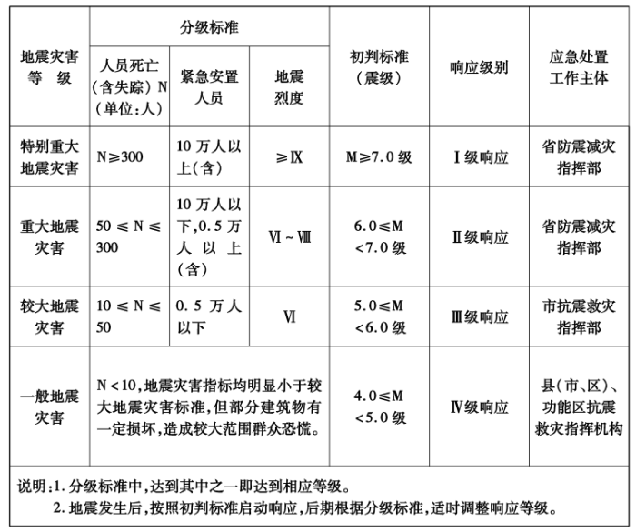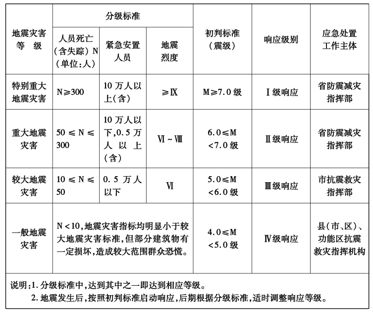 地震灾害事件分为特别重大、重大、较大和一般四个级别,与其对应的响应级别分别为Ⅰ、Ⅱ、Ⅲ、Ⅳ级。