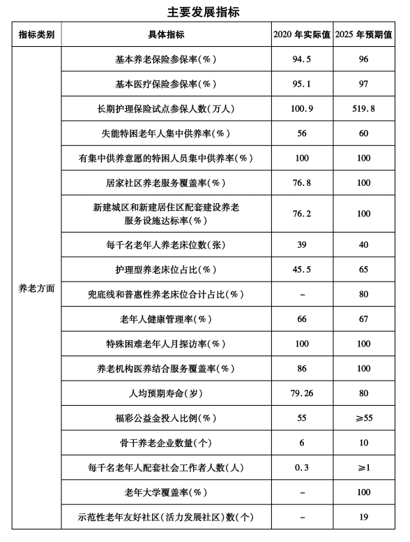 (一)主要目标。到“十四五”末,全市新增养老床位10000张、托位8000个。以居家为基础、社区为依托、机构为支撑的多方参与、功能齐全、布局合理、监管到位的养老托育服务体系更加完善,政策体系更加健全,服务能力不断增强,养老托育事业和产业蓬勃发展,老年宜居、儿童友好的环境初步形成。城乡养老服务设施覆盖率明显提升,县(市、区)、乡镇(街道)、村(社区)、家庭四级养老服务网络基本形成,长期护理保险制度更加完善,普惠养老、互助养老全面发展,家庭养老支持措施进一步强化;市县两级托育示范指导中心建设完成,托育服务机构加快扩容,家庭婴幼儿照护服务有序推进,婴幼儿照护服务管理体制机制初步建立;政府监管、行业自律、社会监督相结合的养老托育服务综合监管制度更加完善,养老托育服务与文化、教育、家政、医疗、旅游、制造等行业融合发展,形成一批特色鲜明、竞争力强的龙头企业、服务品牌和产业集群。