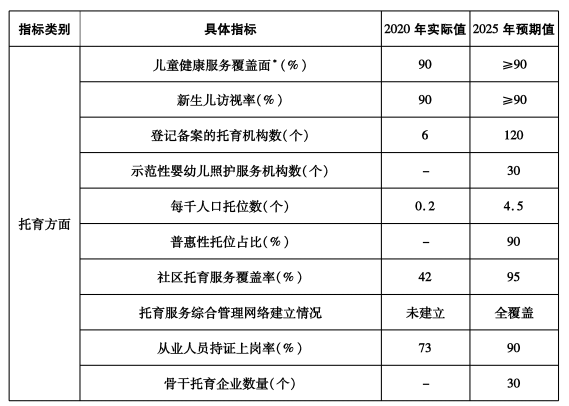 (一)主要目标。到“十四五”末,全市新增养老床位10000张、托位8000个。以居家为基础、社区为依托、机构为支撑的多方参与、功能齐全、布局合理、监管到位的养老托育服务体系更加完善,政策体系更加健全,服务能力不断增强,养老托育事业和产业蓬勃发展,老年宜居、儿童友好的环境初步形成。城乡养老服务设施覆盖率明显提升,县(市、区)、乡镇(街道)、村(社区)、家庭四级养老服务网络基本形成,长期护理保险制度更加完善,普惠养老、互助养老全面发展,家庭养老支持措施进一步强化;市县两级托育示范指导中心建设完成,托育服务机构加快扩容,家庭婴幼儿照护服务有序推进,婴幼儿照护服务管理体制机制初步建立;政府监管、行业自律、社会监督相结合的养老托育服务综合监管制度更加完善,养老托育服务与文化、教育、家政、医疗、旅游、制造等行业融合发展,形成一批特色鲜明、竞争力强的龙头企业、服务品牌和产业集群。