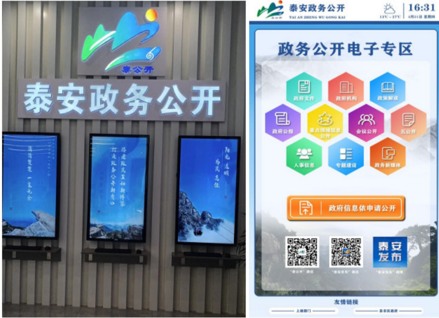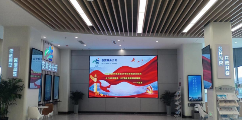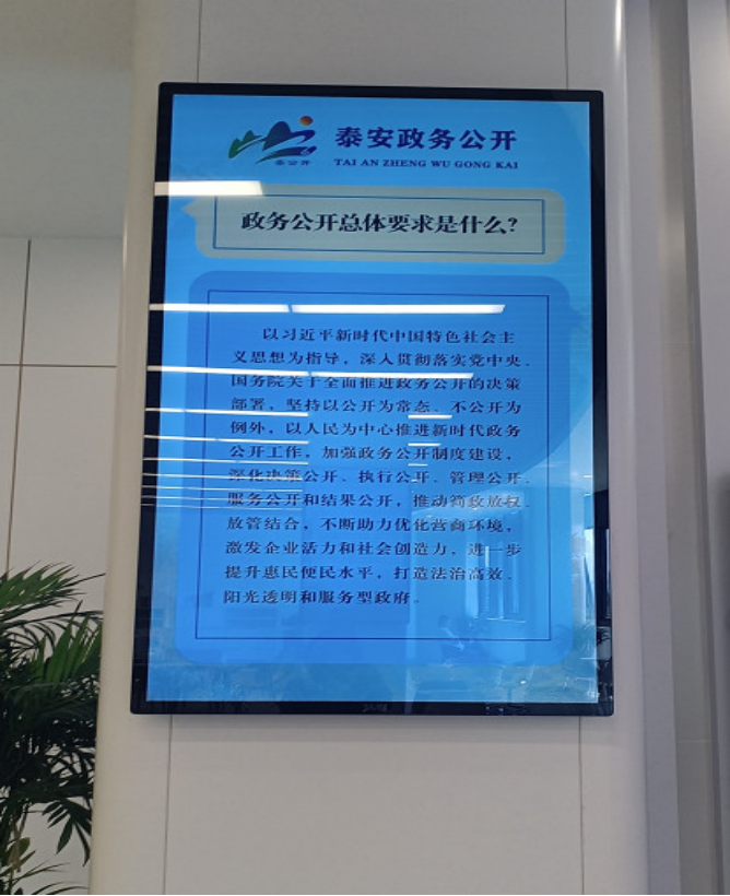 聚焦宣传推介,让政务公开一目了然。精心设计“泰公开”logo标识,打造具有泰安特色和地区影响力的政务公开品牌。配备LED显示屏、立式广告机等数字化设备,围绕“什么是政务公开、政务公开公开什么、如何进行政务公开”等内容,采用文字、图片、视频、动漫等多种形式,滚动播出政务公开宣传片、政策文件、政策解读发布会和解读视频等内容,让群众面对面、零距离了解政务公开,营造浓厚的政务公开宣传氛围。