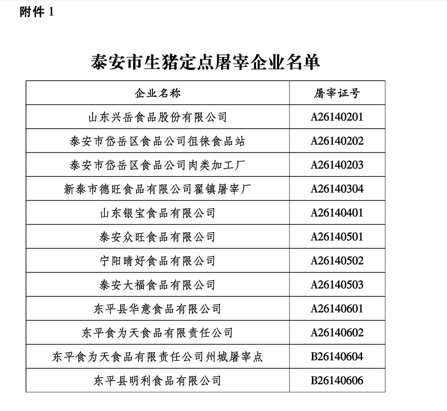 泰政办字〔2022〕32号 泰安市人民政府办公室关于公布泰安市生猪定点屠宰企业名单的通知