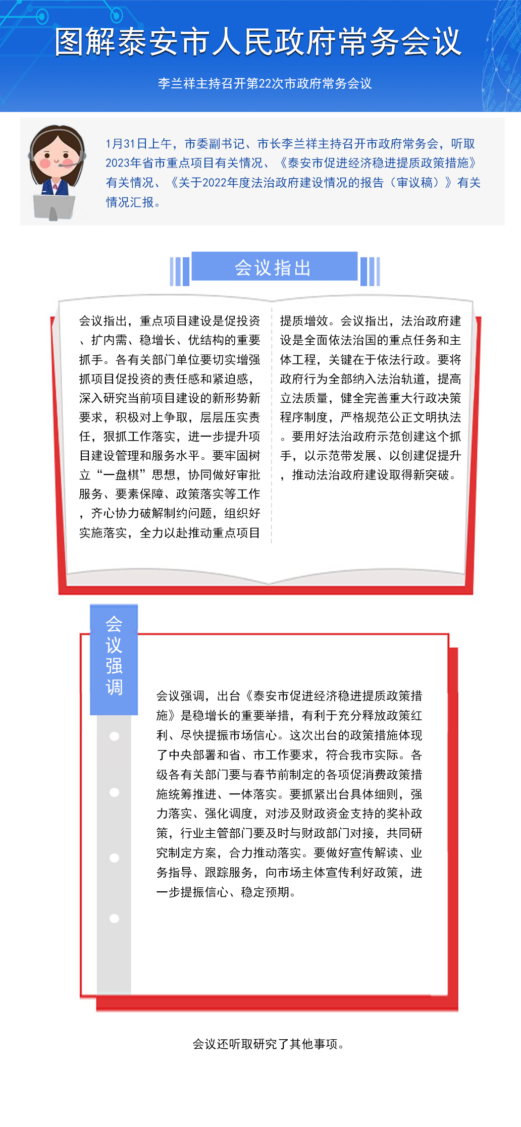会议议题:听取2023年省市重点项目有关情况、《泰安市促进经济稳进提质政策措施》有关情况、《关于2022年度法治政府建设情况的报告(审议稿)》有关情况汇报。
