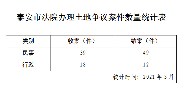 泰安市法院办理土地争议案件数量统计表(2021年3月)